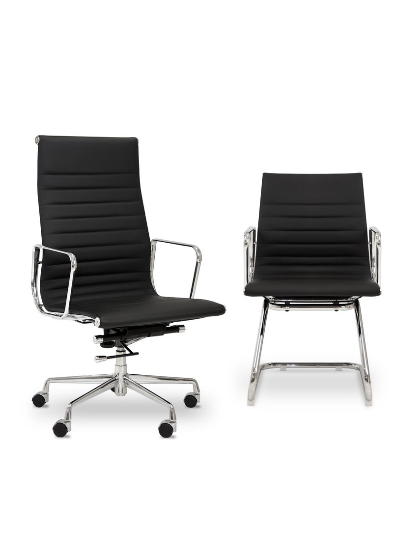 Enna embodies a discreetly elegant and classical combination, that is suited to stylish and sophisticated environments. Refined and mature, Enna offers the perfect union of ribbed soft black leather and chrome. The range provides comfort and style in a high or medium back, with the option to select a cantilever base.